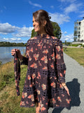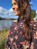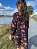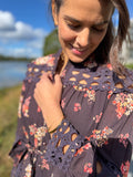 Helt fantastisk kjole med nydelig mønster og de fineste blondedetaljene. Superlekker hele året, enten på sommeren med bare ben eller gjennom høsten og vinteren med strikk og feks. boots. Vakker kjole med masse vidde som kan brukes både med og uten belte. Blondedetaljer over det hele. Knapper i front for lukking.