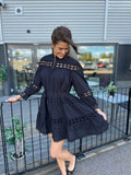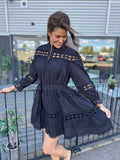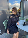 Helt fantastisk kjole med nydelig mønster og de fineste blondedetaljene. Kjolen går til rett over knærne om du ikke er 180cm som Silje. Superlekker hele året, enten på sommeren med bare ben eller gjennom høsten og vinteren med strikk og feks. boots. Vakker kjole med masse vidde som kan brukes både med og uten belte. Blondedetaljer over det hele. Knapper i front for lukking.